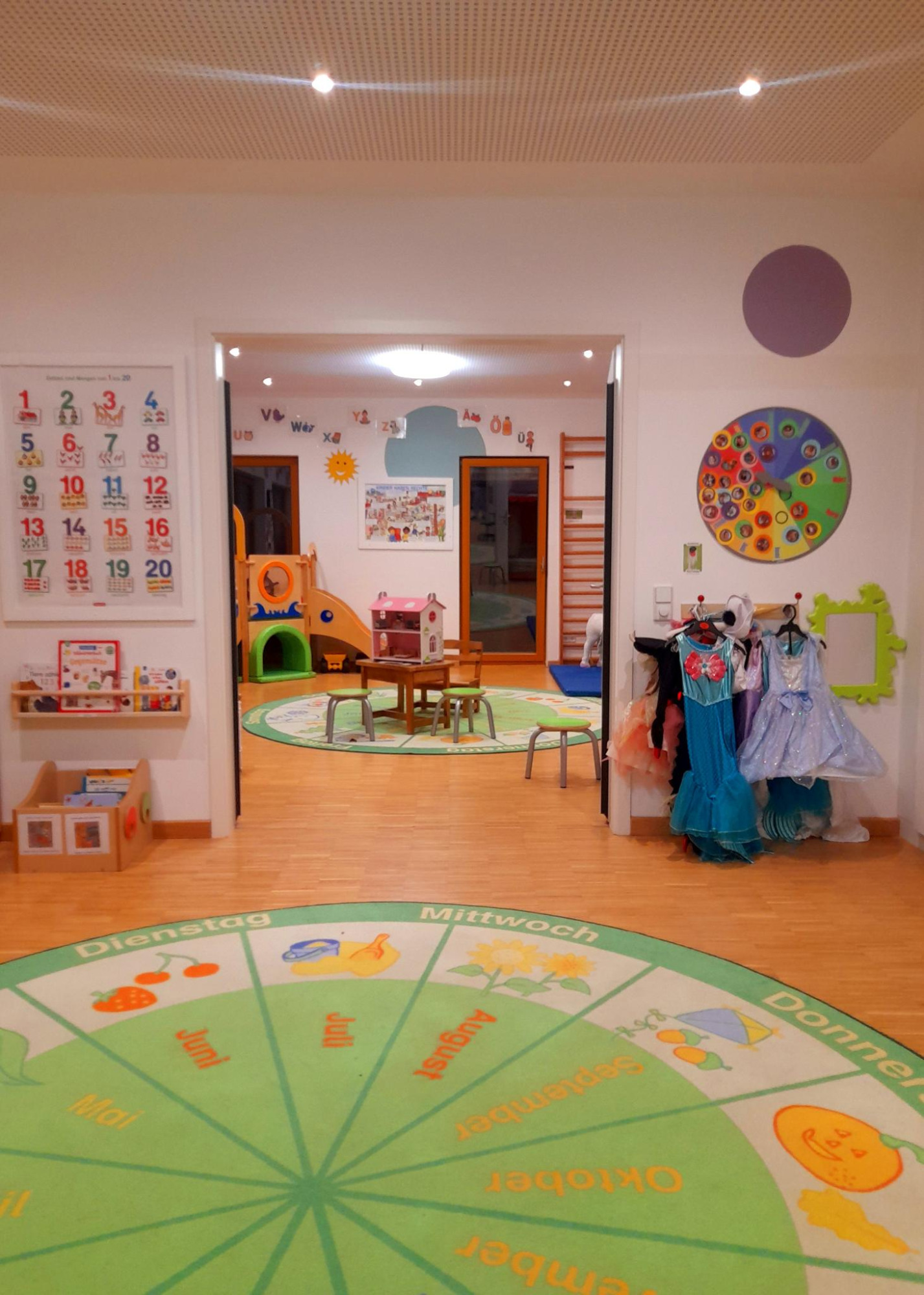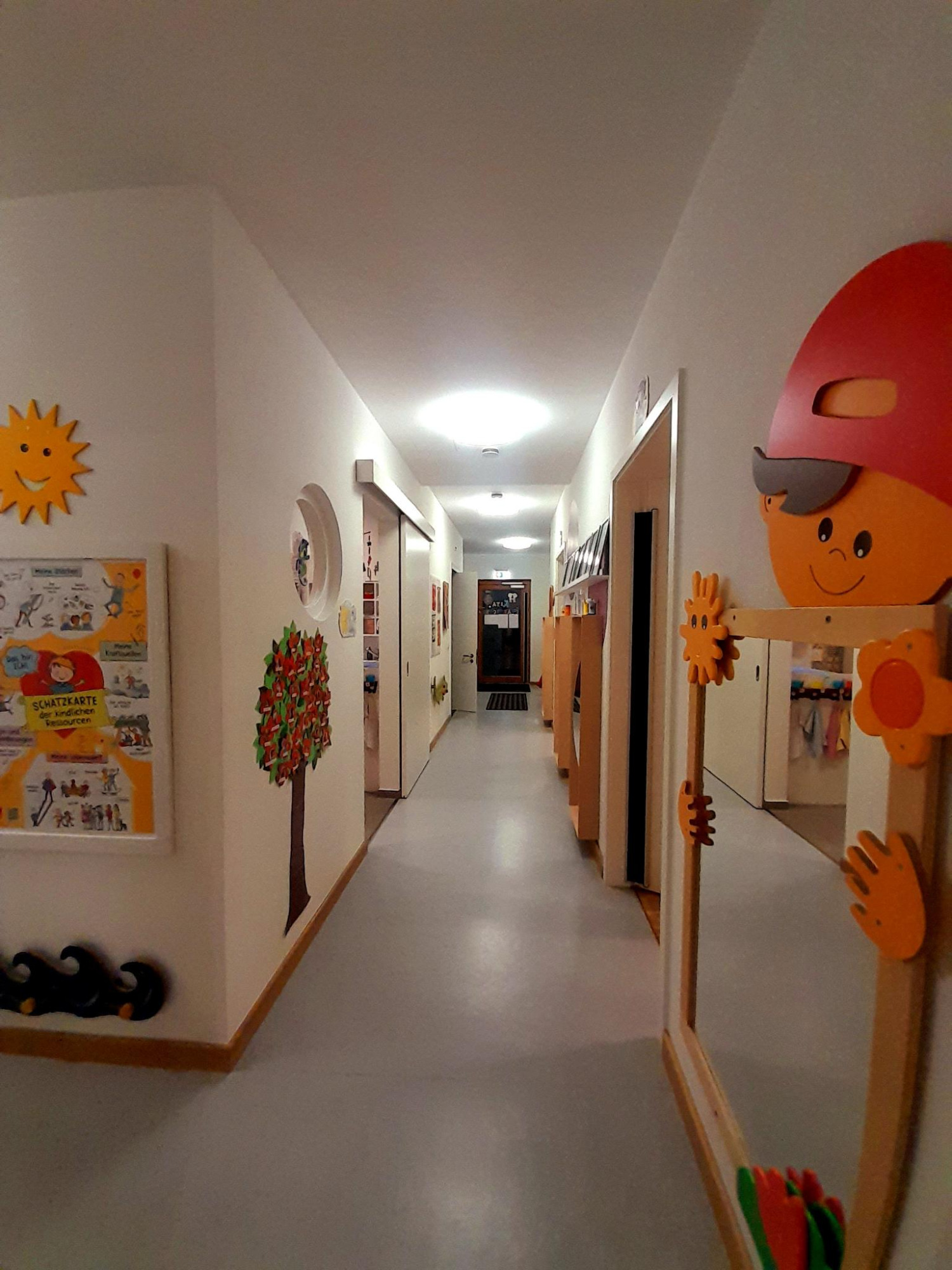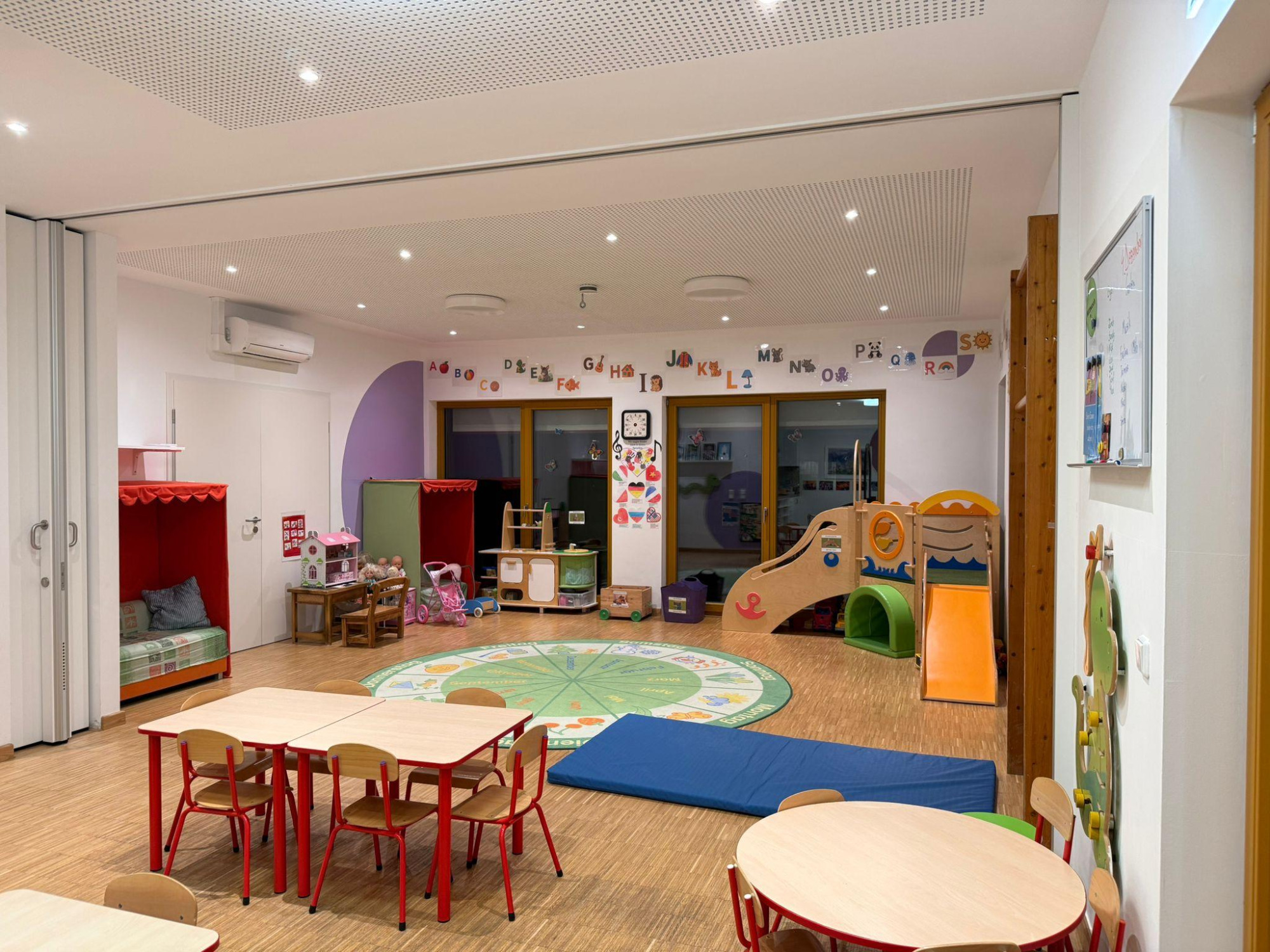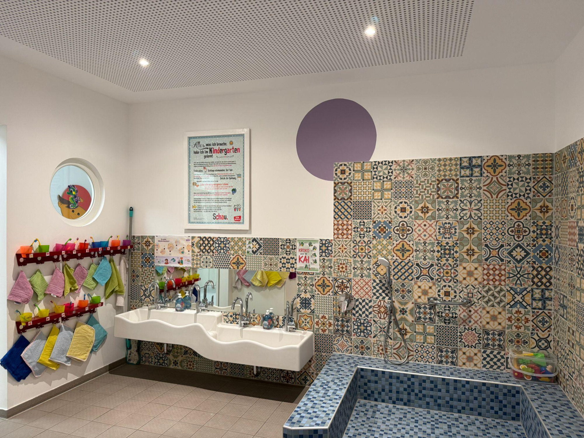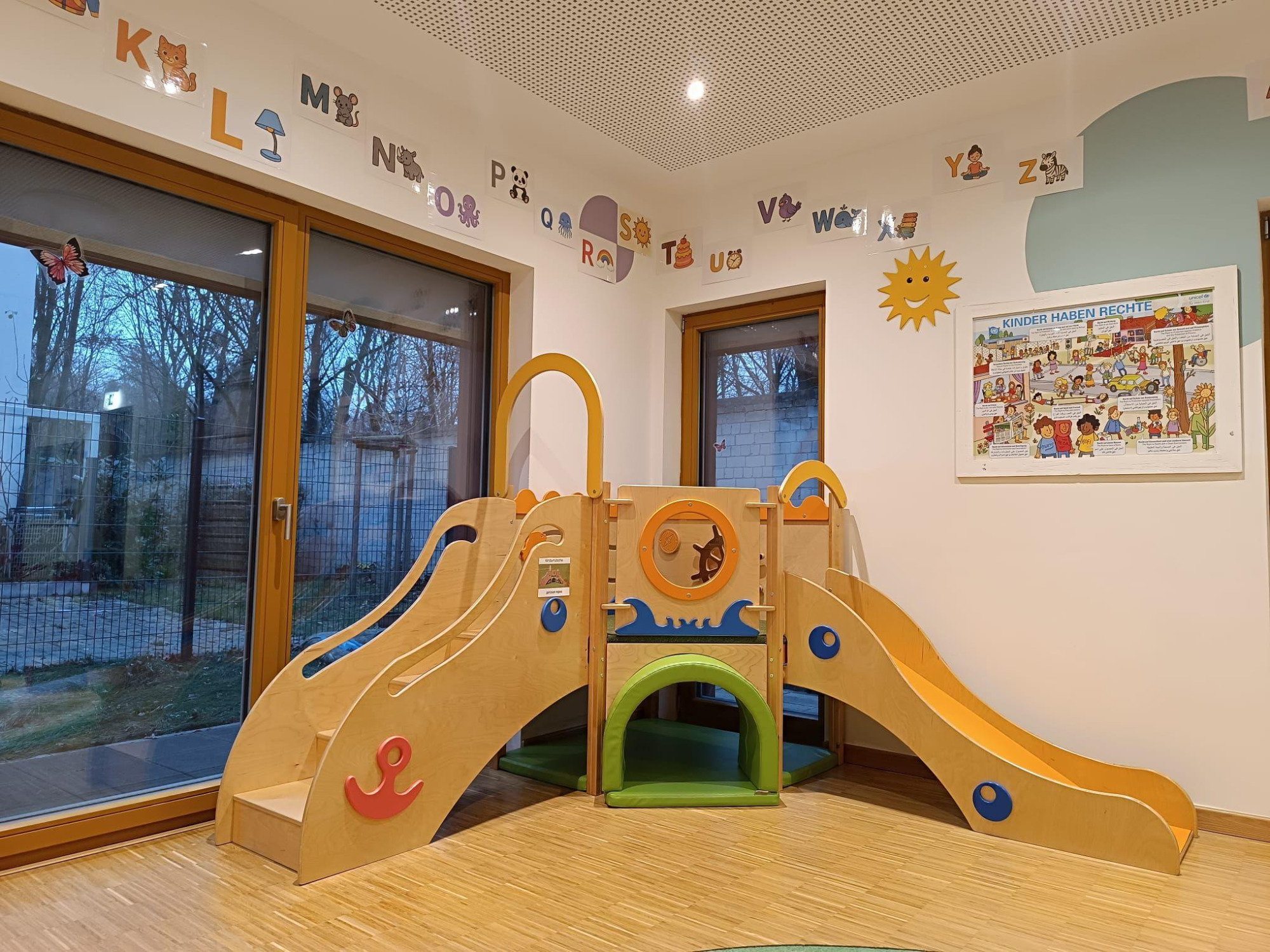 In unserem Kindergarten bieten wir drei gut ausgestattete Gruppenräume, ein großes Kinderbad, eine gemütliche Küche und einen Ruheraum, in dem sich die Kinder entspannen können. Zusätzlich gibt es direkt angrenzend einen Außenbereich, der mit Balancierhölzern, einem Sandkasten und verschiedenen Spielecken ausgestattet ist, sodass die Kinder viel Spaß und Bewegung an der frischen Luft haben können.