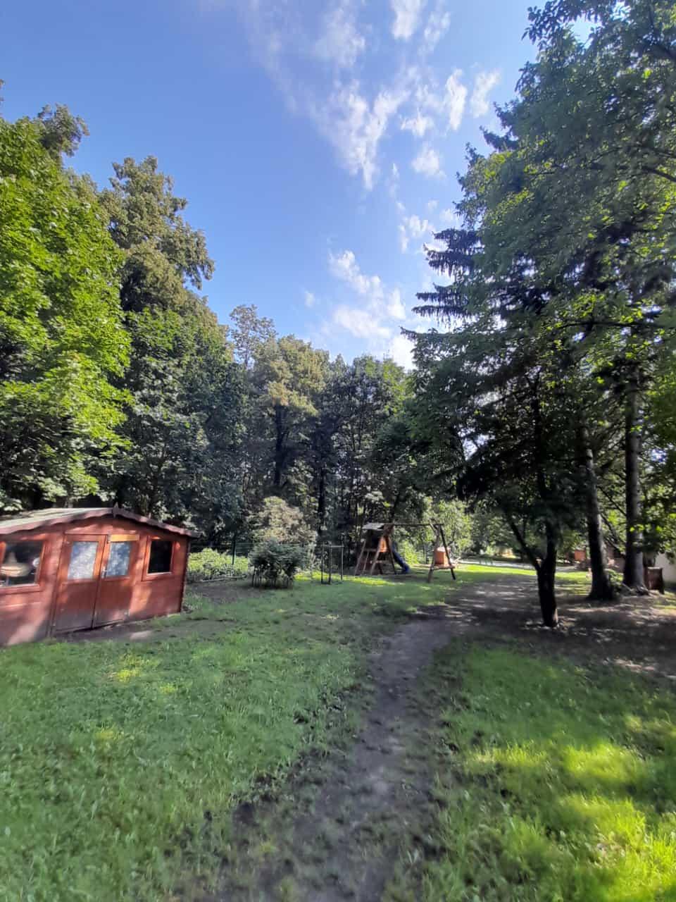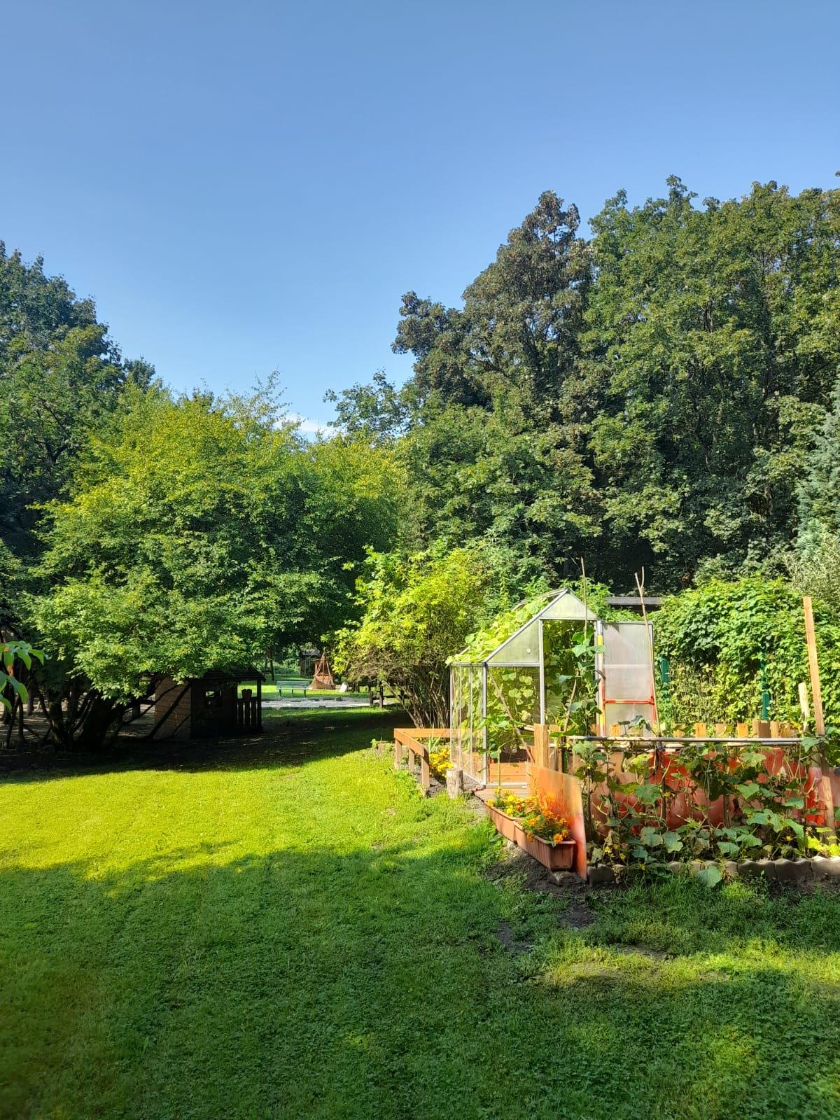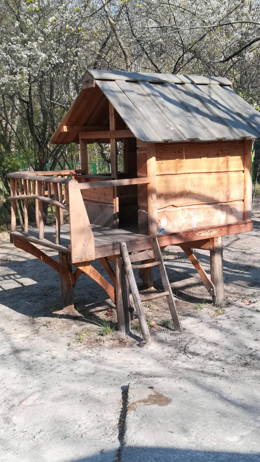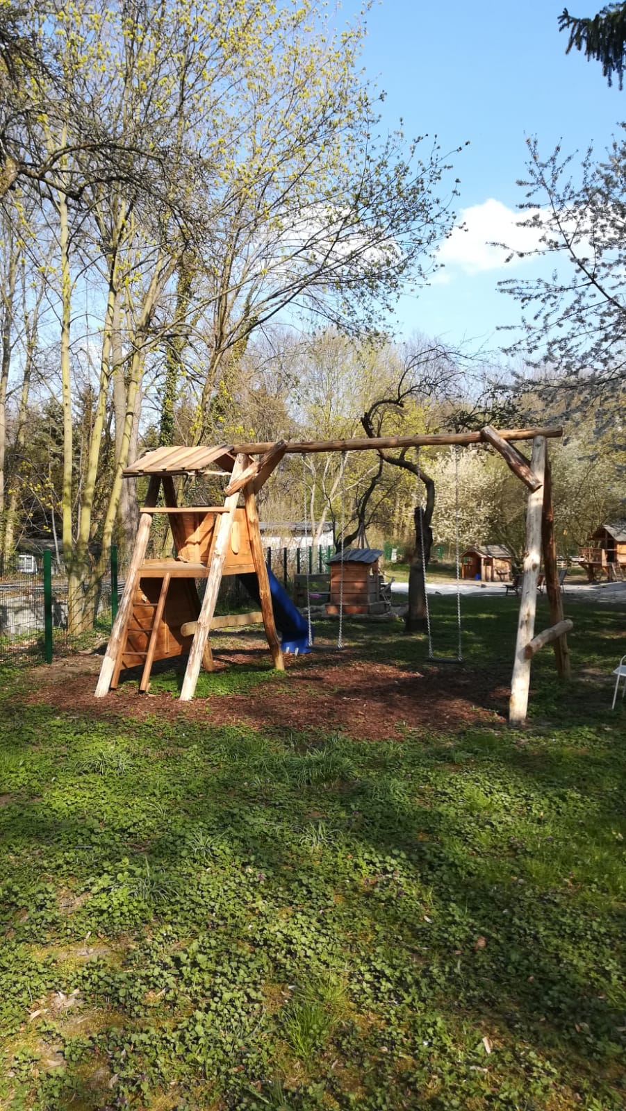 Dort gibt es Spiel- und Gartenhäuschen, eine Wippe, (Holz-)Spielgeräte, einen großen Sandkasten, ein Gewächshaus und mehrere Beete.